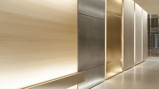 Sleek Metal Wall Paneling: Large metal wall panels with modern textures and prints add visual impact. Popular in lobbies, conference rooms, and office divider walls.