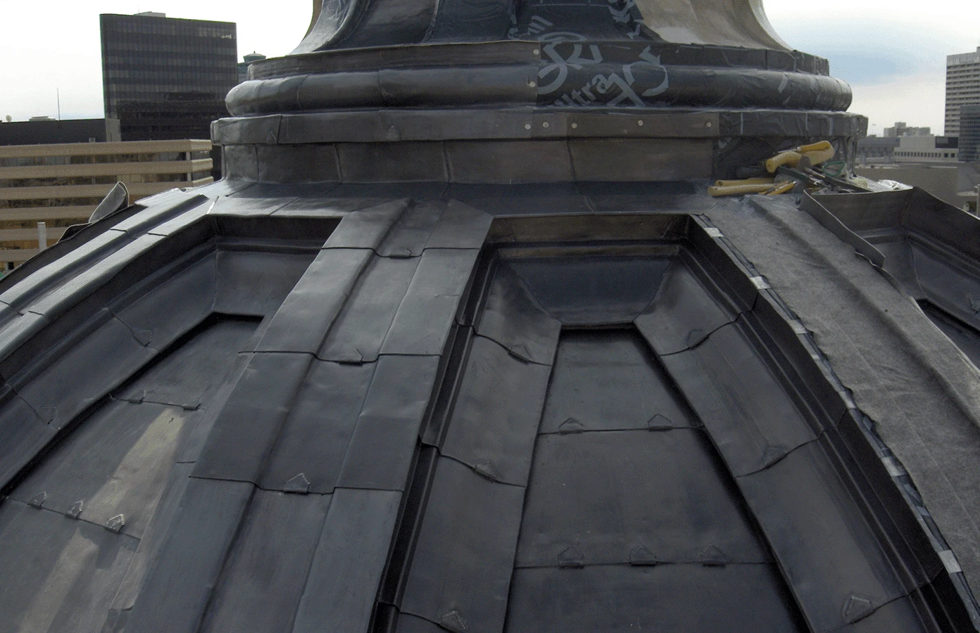 When Heather & Little took on this sheet lead roofing project, the deterioration on the dome was beyond repair by any normal restoration methods so the architect decided to clad the dome in sheet lead because of the extreme malleability which permits forming over almost any detail without excessive preparation or hand work. Such work would not have been economically feasible in any other common metal and a fraction of the cost to replace the terracotta.