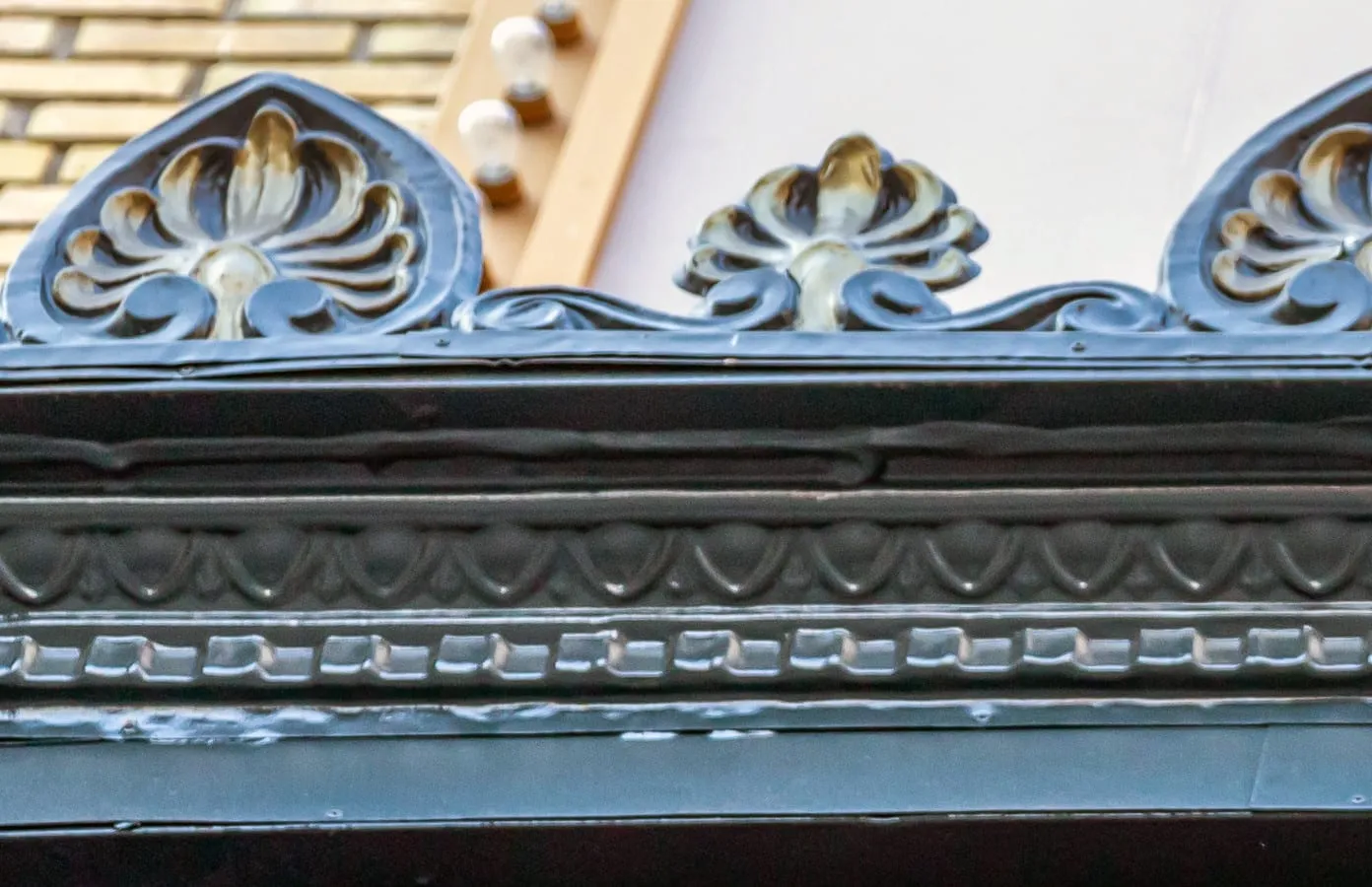 Heather & Little were brought in to repair the 1980s embellishments. When the exterior decorative detailing had been added in the 80s, it was fabricated with light gauge galvanized sheet metal that needed some care and restoration. H&L recreated the sections of the decorative metal work that needed to be repaired with stamped sheet copper in approximately 3–4-foot sections. The copper was chosen over galvanized as it was more malleable in taking the low-profile stamping details and would have a longer life span. Areas recreated included the Yonge St. marquee, egg and dart mini cornice, rope detail and the “picture frame” detail. The copper was then painted black with gold highlights and installed on site along with the remaining elements like the cast aluminum art deco “lady” panels, that were in good condition. To learn more about the Mirvish Theatre's decorative stamped sheet metal refurbishment and historic building restoration, browse our gallery of images.