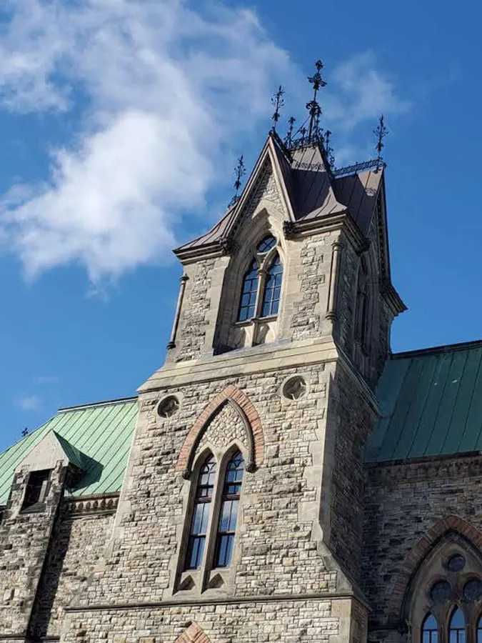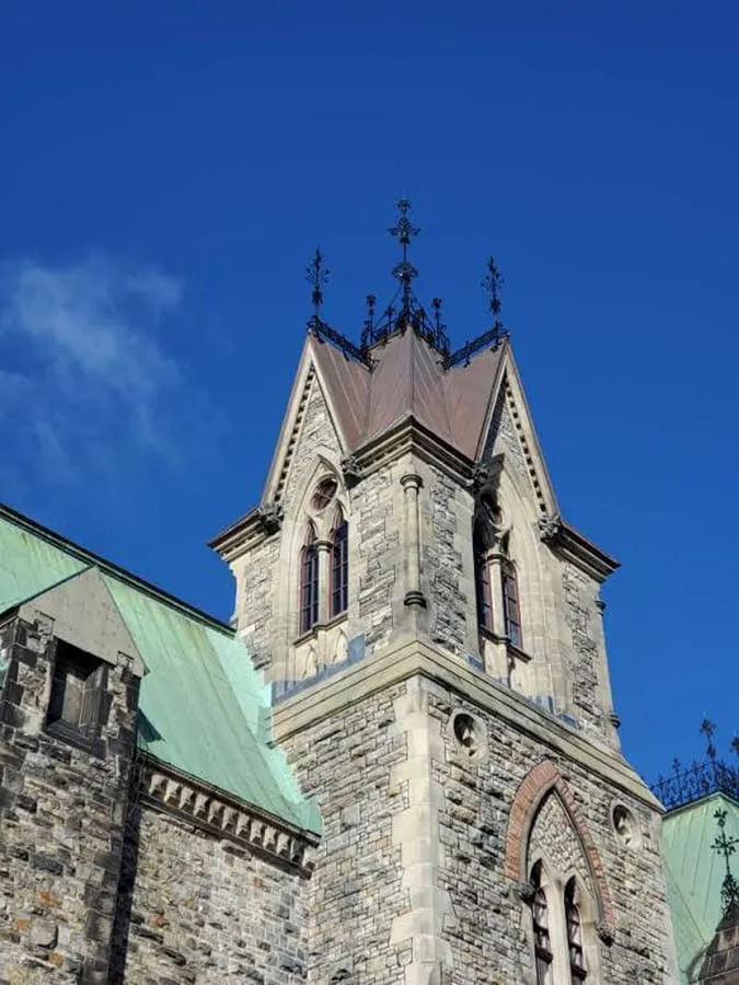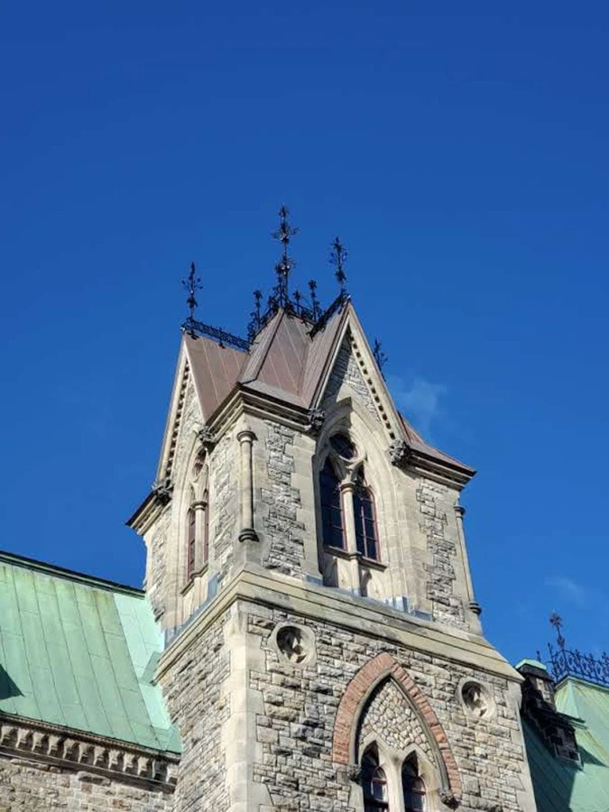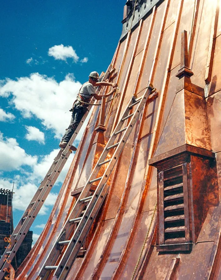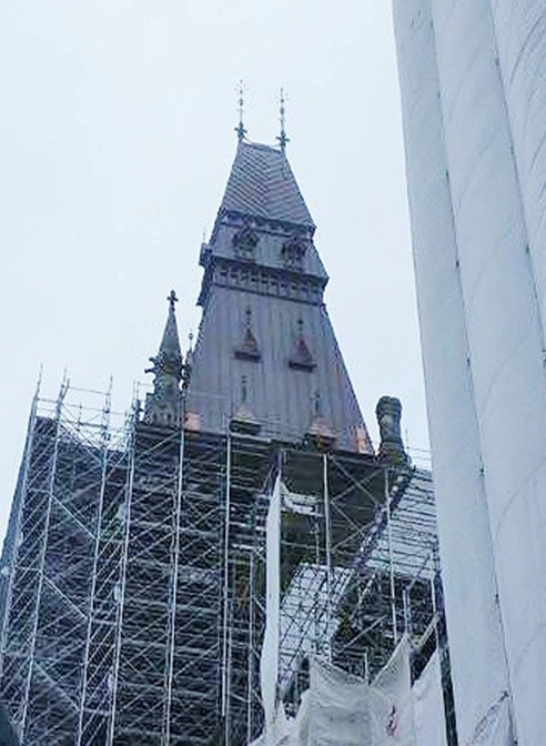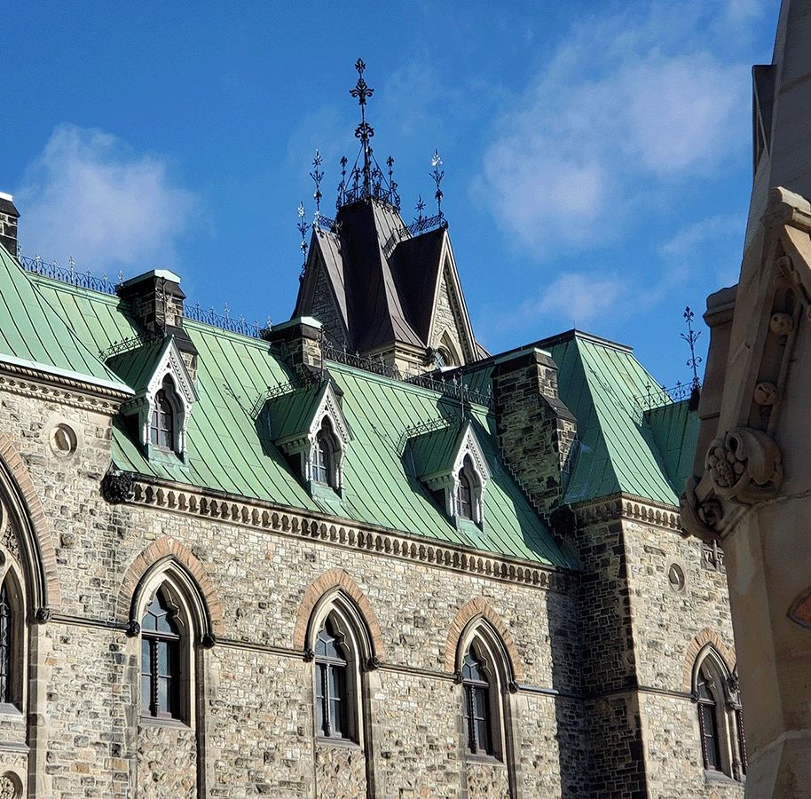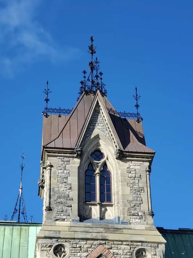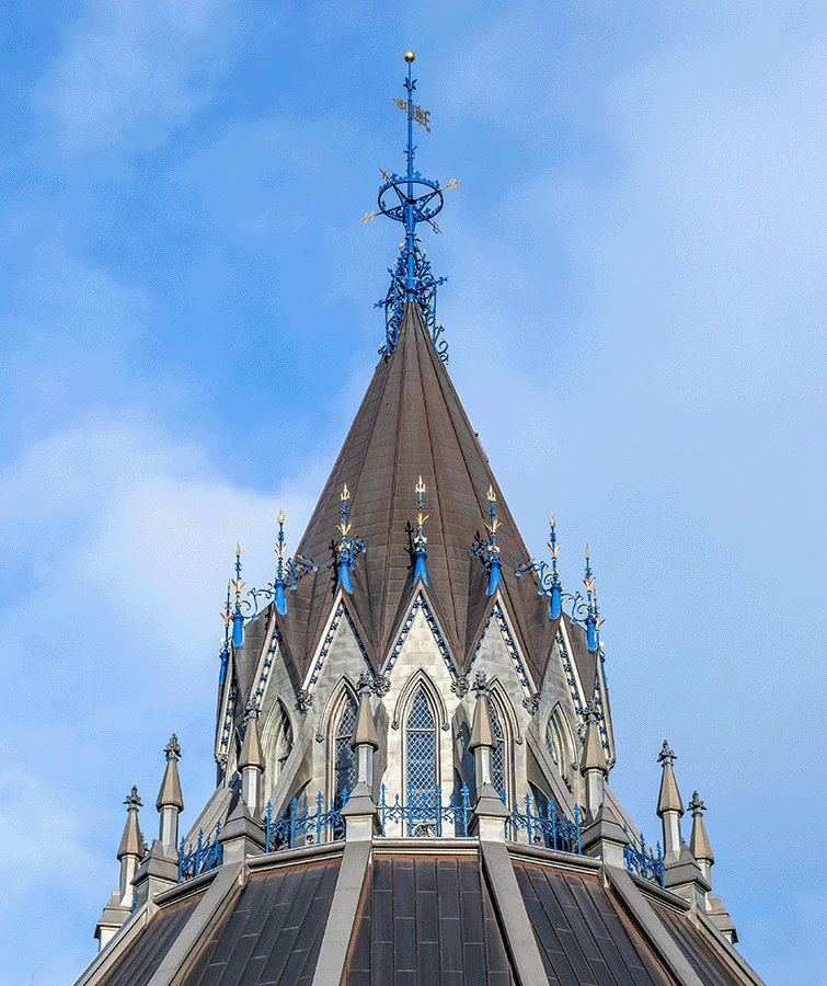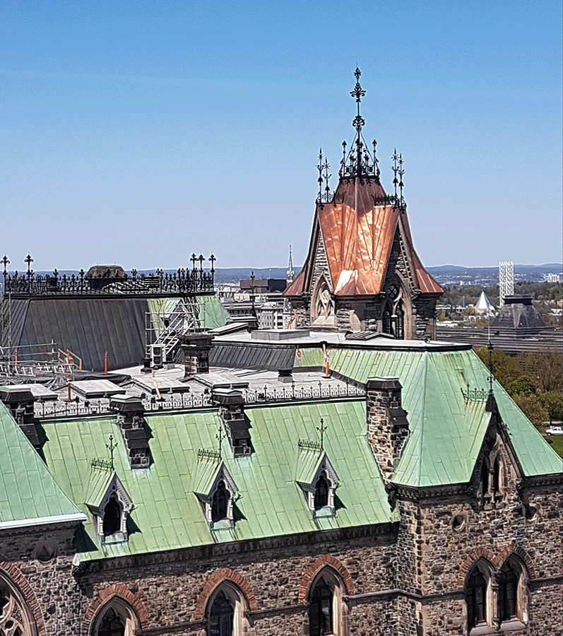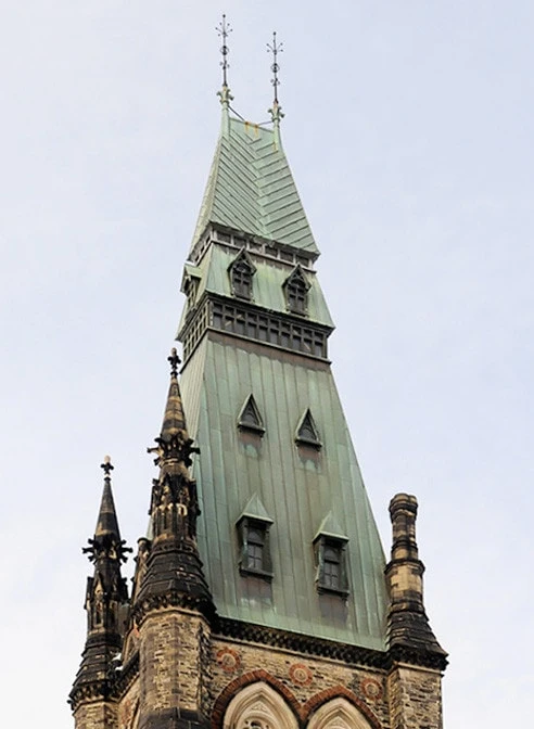 The historic Peace Tower stands at 302 feet and 6 inches tall and includes 270 gargoyles and other ornamental designs. After years of harsh weather conditions and inevitable erosion, the copper sheet metal roofing covering the Peace Tower needed thorough restoration.