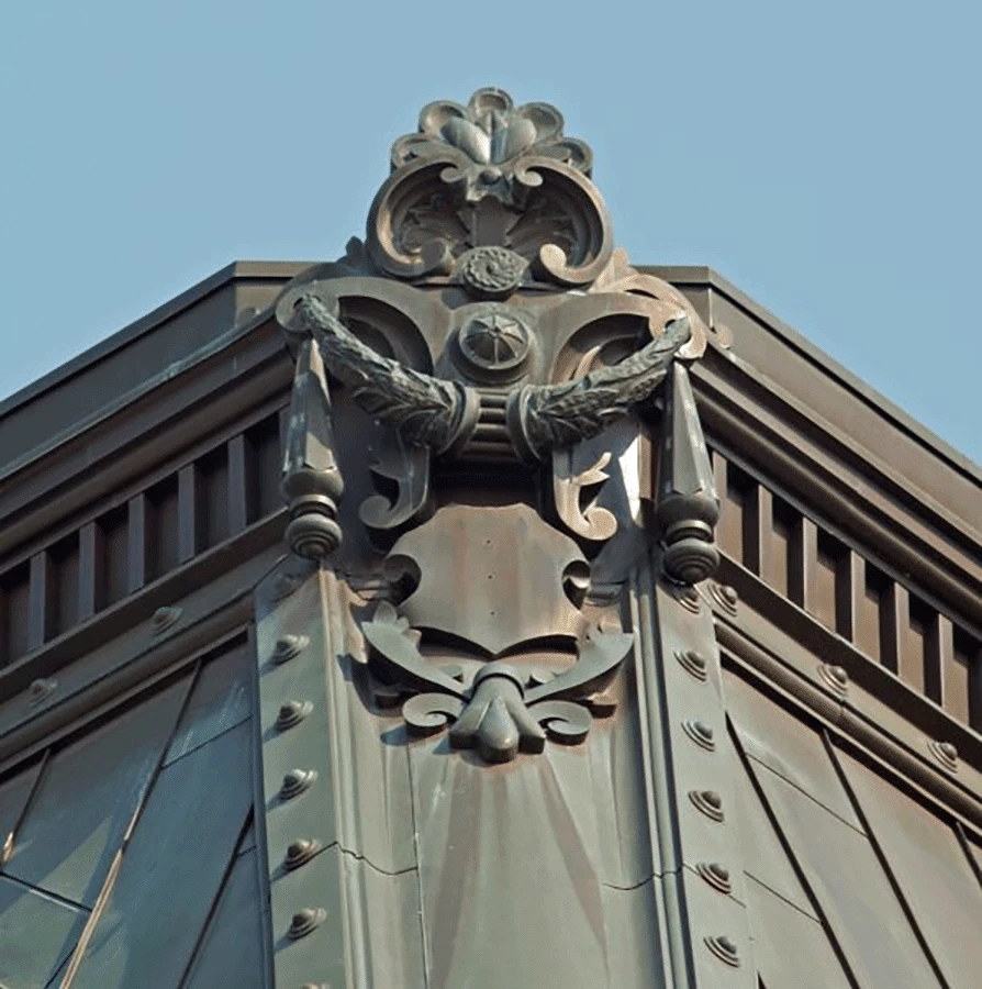 When Heather & Little took on this project, there was a significant amount of work that needed to be performed to restore the mansard copper roofing. A complete removal of the old copper roofing system was necessary, and decorative stamped metal items were replicated. The restoration of decorative ornaments included stamped sheet metal roof crestings, finials, cartouche, cornices and decorative copper hip covers. Designs for the decorative sheet metal items were stamped into the copper sheets to replicate original items that were damaged over time.