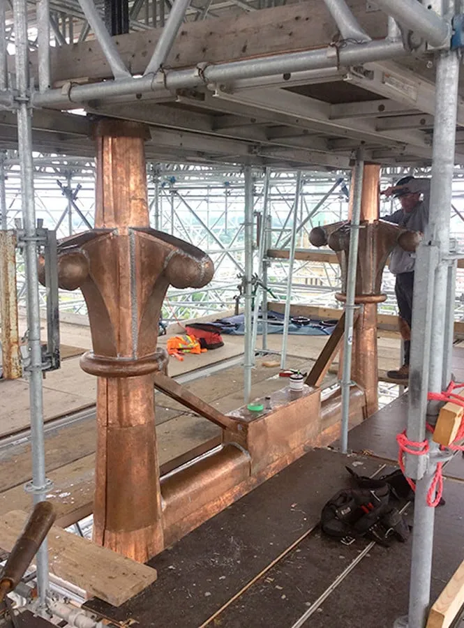 Approximately 1,390 square metres of materials were used to replace both the galvanized iron and lead-coated copper. Another 110 square metres of 1.2-mm stainless steel were used to fabricate built-in stainless rain gutters. Heather & Little installed sheet metal that had been hand brake formed in our shop. Roof structures that were clad in this project included the lantern walls, lantern windows, upper flying buttresses, and pinnacles. As well, we fabricated and installed buttress cap flashing, and main roof ribs and installed a plate bronze snow arrest system and Kalamein windows clad with monel sheet metal.