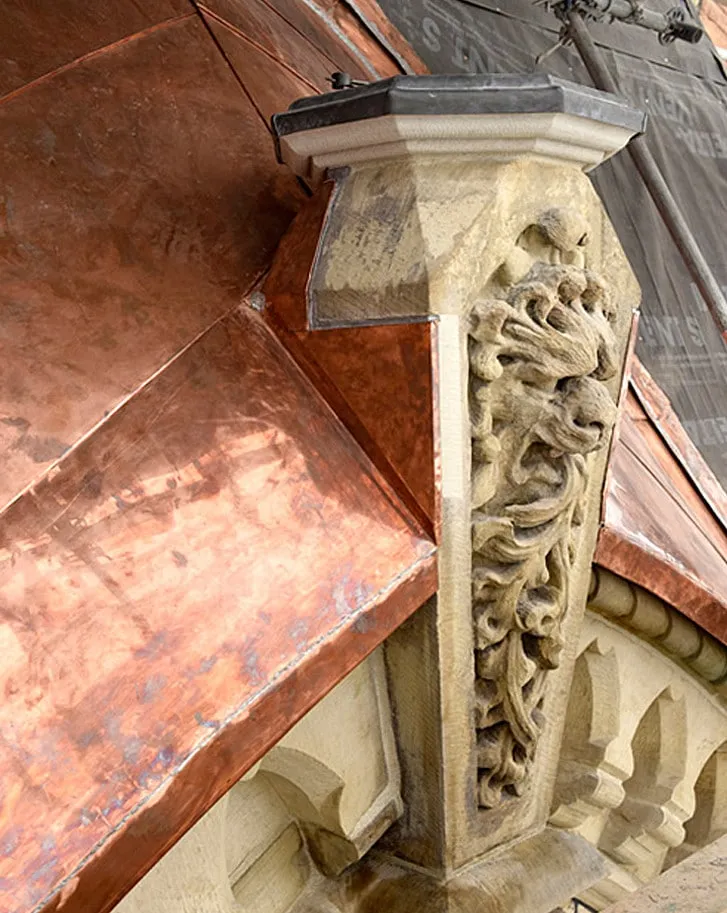 This restoration involved the total removal of old copper batten roofing and its replacement by our coppersmiths, restoration of the copper clad Kalamein windows, tower finials, and copper cresting. Our artisans also clad many of the exposed masonry elements in eight-pound sheet lead to protect them from further deterioration. Within the courtyard, the visible copper roofs were repaired with oxidized panels selected for their green patina from existing portions of the roof, before the latter was re-finished with new copper. Awarded a North American Copper in Architecture Award (NACIA).