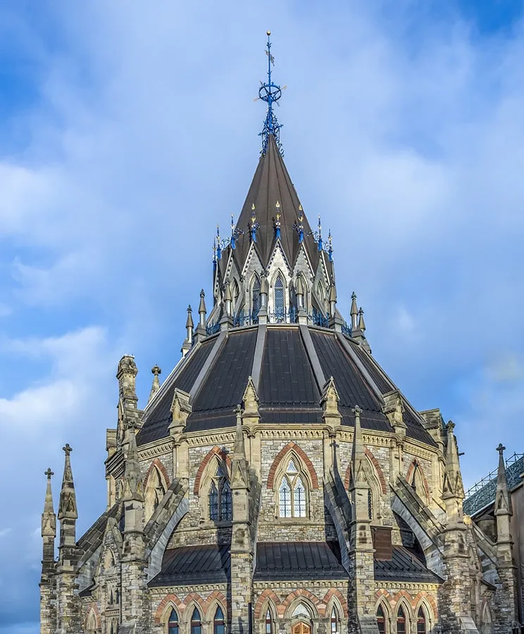 The National Library of Canada or Library of Parliament (built 1859-1876) is inspired by the British Museum Reading Room in London, England. It was built as a separate area of the Centre Block and attached by a corridor. Known for its unique round shape that houses multiple galleries, the archival records of the Government of Canada and over 600,000 items, it has been plagued with difficulties, requiring repeated renovations. A fire in 1916 almost permanently destroyed it and fire struck again in 1952. In February of 2002, the Library of Parliament was closed as work began on a thorough restoration including roof and building envelope, masonry, systemic upgrades, and mechanical restoration. Competitive tendering ensued, and Heather & Little won the bid to restore this outstanding structure.