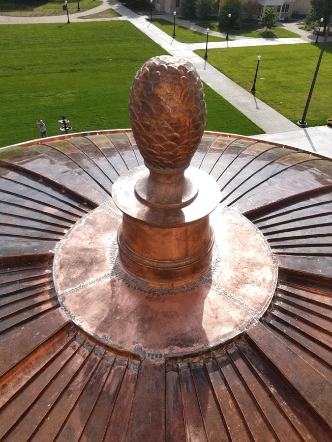 Creating the copper dome was an enormously challenging project. The copper dome panels were laid out in a pattern consisting of 3-courses of tapered pans with standing seam locks. The dome included raised rib pans every seven tapered pans to achieve the final aesthetic and the roof's water tightness. Moreover, joints had to be staggered. Each panel was unique, and had to be carefully laid out by hand and have a compound curve applied to fit the dome structure in Michigan. This demanded a large dose of confidence and trust as we were not able to test the fit on site prior to transporting the finished components to Michigan. Our math had to be perfect. When it came time to install, the dome went up without a hitch, a testament to our skilled craftsmen and the powers of math. To learn more about the Christ Chapel Pinecone and Dome, browse our gallery of images.