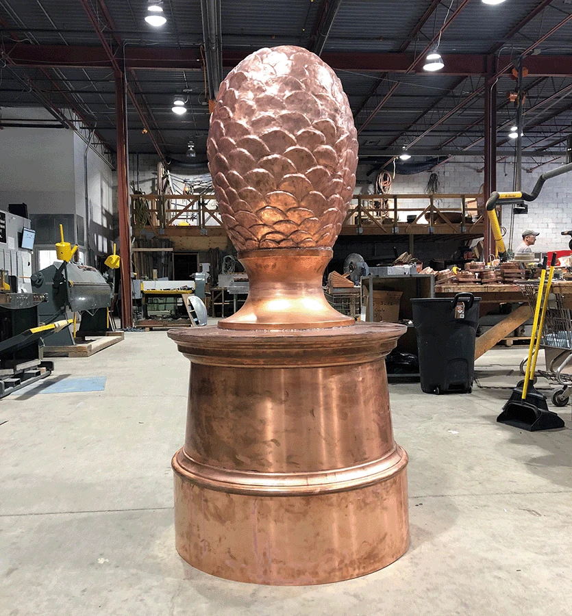 The H&L team are particularly proud of the pinecone finial. Professor Stroik had identified that he wanted a pinecone, but the details and design were entrusted to our artisans. The pinecone was first drawn by hand, then the 5’x3’ finial was created using the traditional repoussé technique which entails hand-hammering a copper sheet into a handmade mold. This is the same technique used on the Statue of Liberty, although on a much smaller scale. The sections of the pinecone were soldered together and finished to appear seamless. It’s a painstaking procedure, requiring skill, patience and experience to get just right. Approvals were obtained remotely each step of the way by sharing sketches and photographs. Considering its ultimate destination in a church, it's perhaps apt that it called for a leap of faith when delivering the final pinecone finial. After only sharing the piece in a 2D representation, would it live up to the expectations of the owners and architect? It did, and the pinecone found its pride of place atop the copper dome.