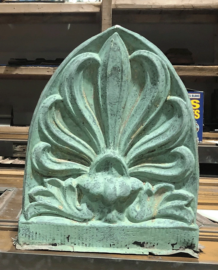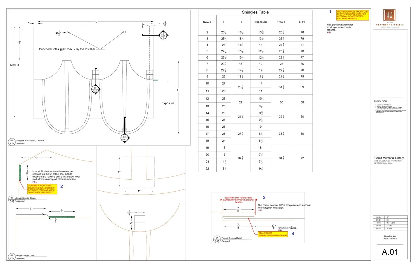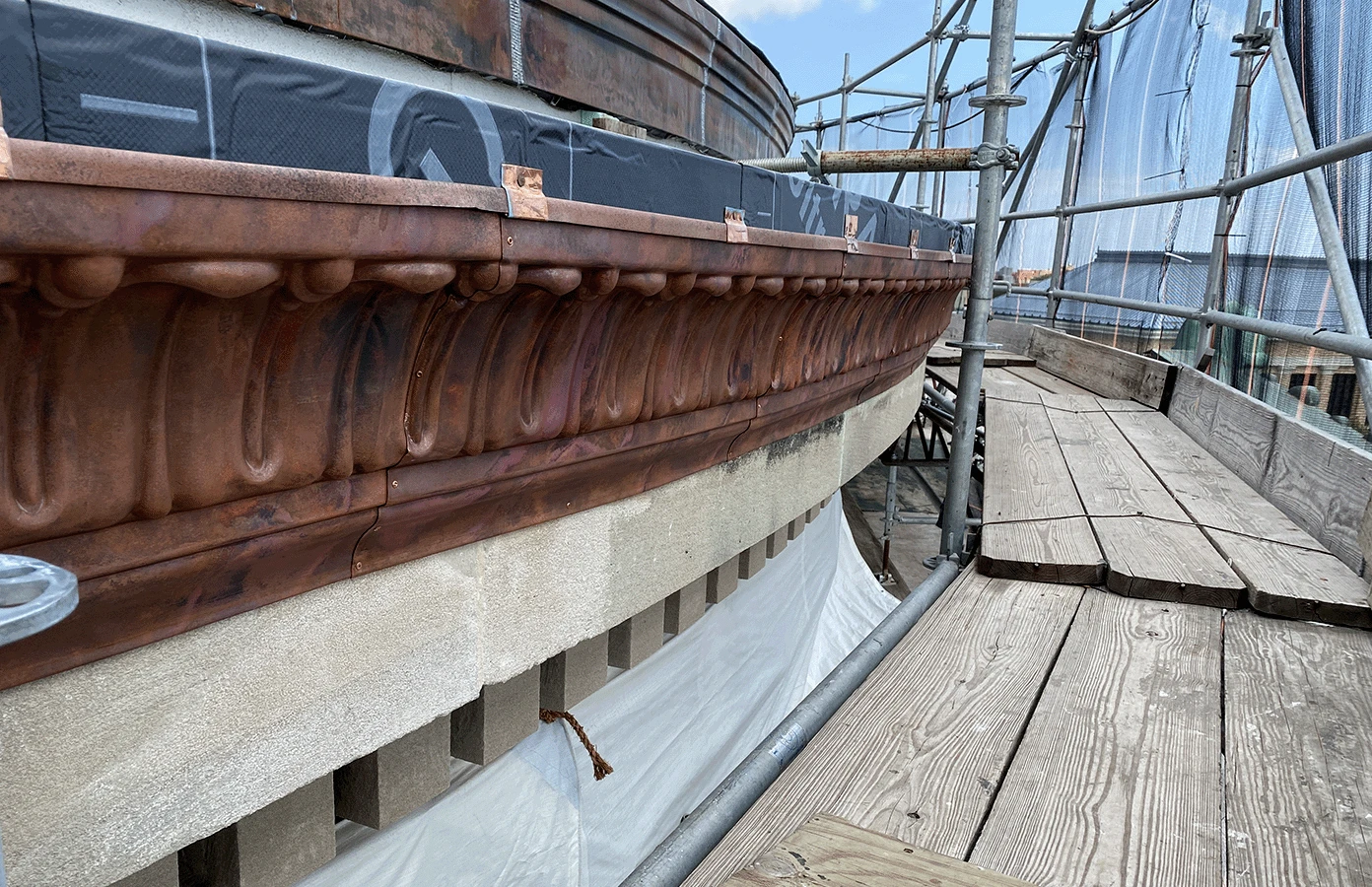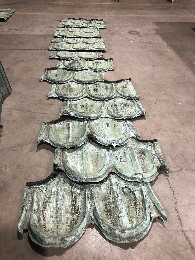 This historic roof restoration project called for a demanding combination of stamped copper elements requiring many moulds and dies while preserving the history of the Gould Memorial Library. Work was executed using both traditional and modern techniques. Dozens of different shingle configurations had to be produced, from singles to various multiples, and the sizes of the shingles ranged from 10 inches to 17.5 inches long. Original decorative copper work requiring replacement included 357 of the original 476 antefixae, as well as Vitruvian wave scrolling, drum stepped fascia, and leaf-patterned cornice. All the pieces needed to be created as samples, sent to New York for approval, and then produced to extremely demanding deadlines. Once the scaffolding goes up to retrieve reference examples, the clock starts ticking to deliver the finished product.