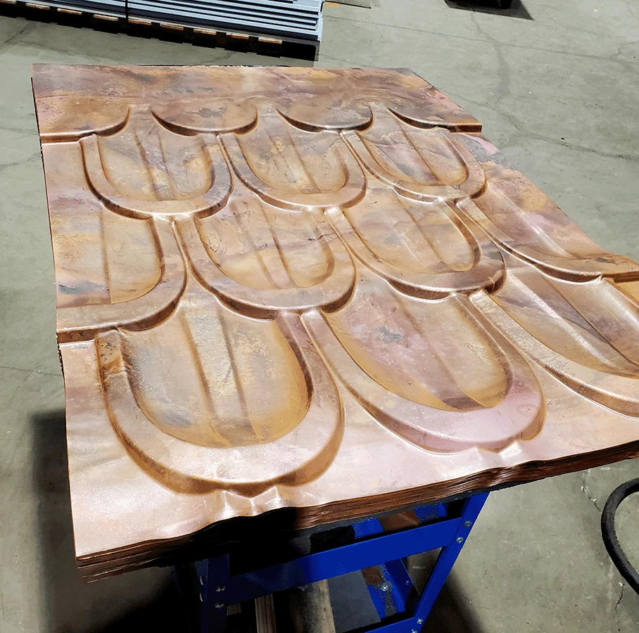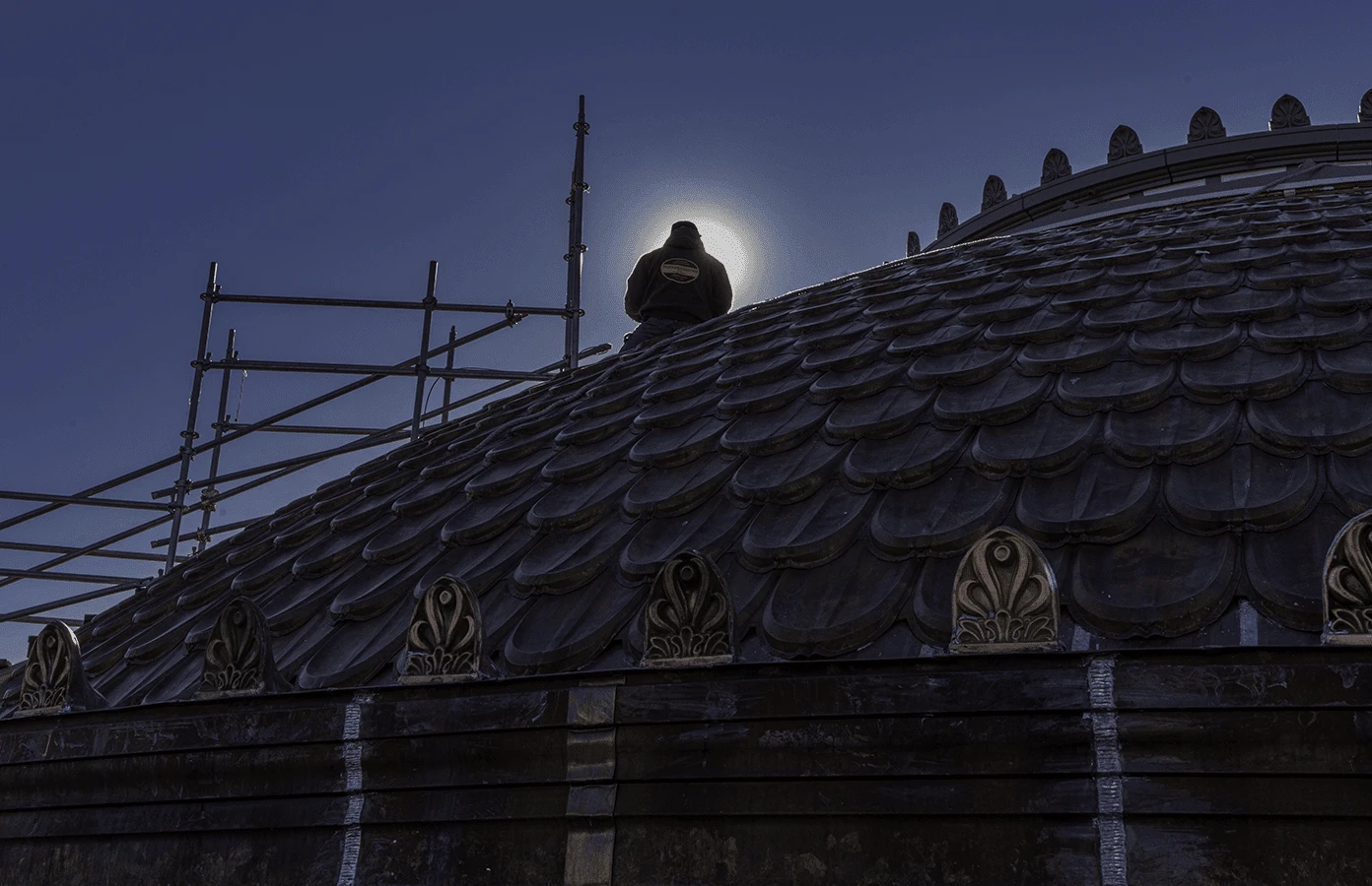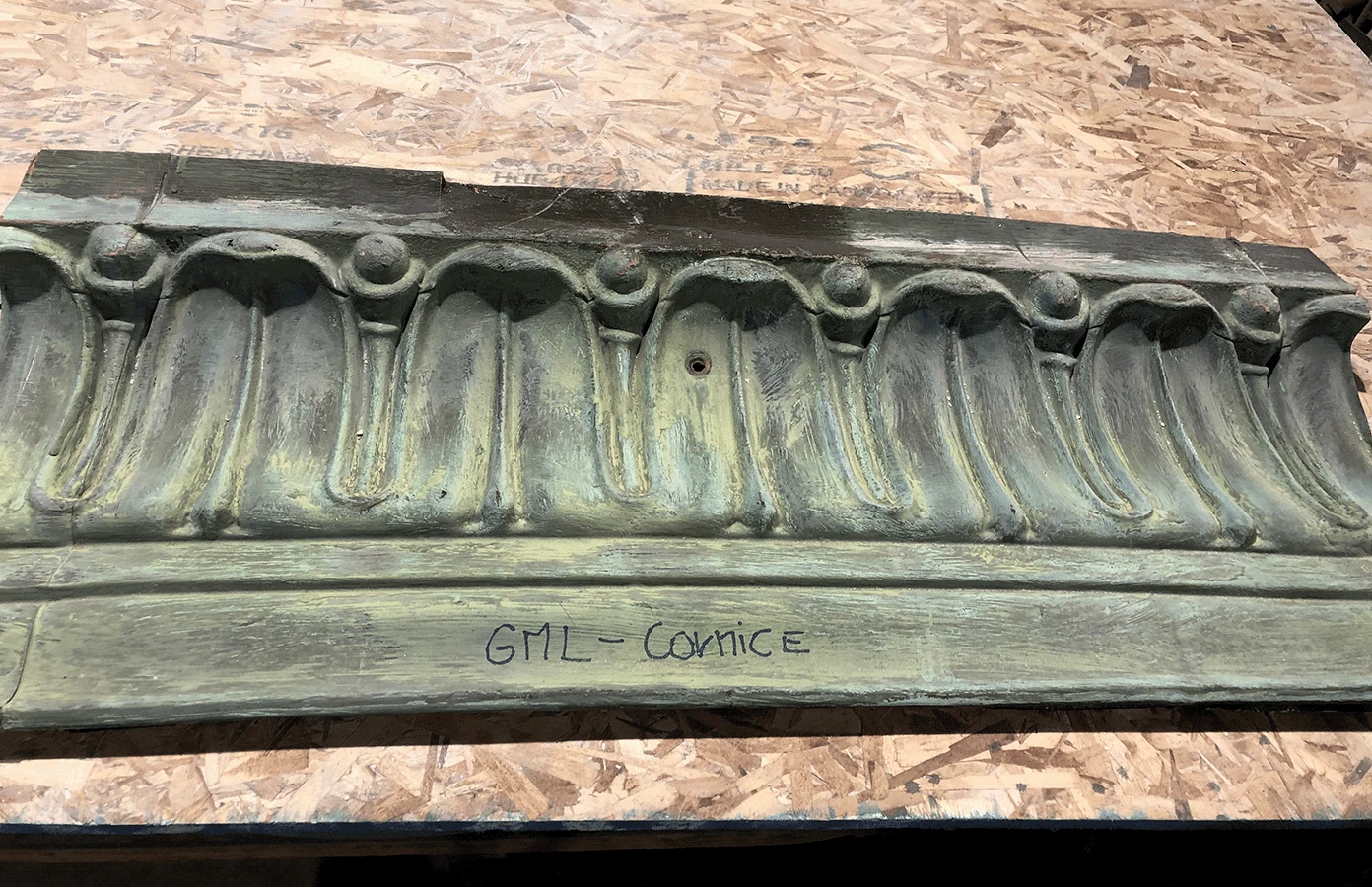 This historic roof restoration project called for a demanding combination of stamped copper elements requiring many moulds and dies while preserving the history of the Gould Memorial Library. Work was executed using both traditional and modern techniques. Dozens of different shingle configurations had to be produced, from singles to various multiples, and the sizes of the shingles ranged from 10 inches to 17.5 inches long. Original decorative copper work requiring replacement included 357 of the original 476 antefixae, as well as Vitruvian wave scrolling, drum stepped fascia, and leaf-patterned cornice. All the pieces needed to be created as samples, sent to New York for approval, and then produced to extremely demanding deadlines. Once the scaffolding goes up to retrieve reference examples, the clock starts ticking to deliver the finished product.