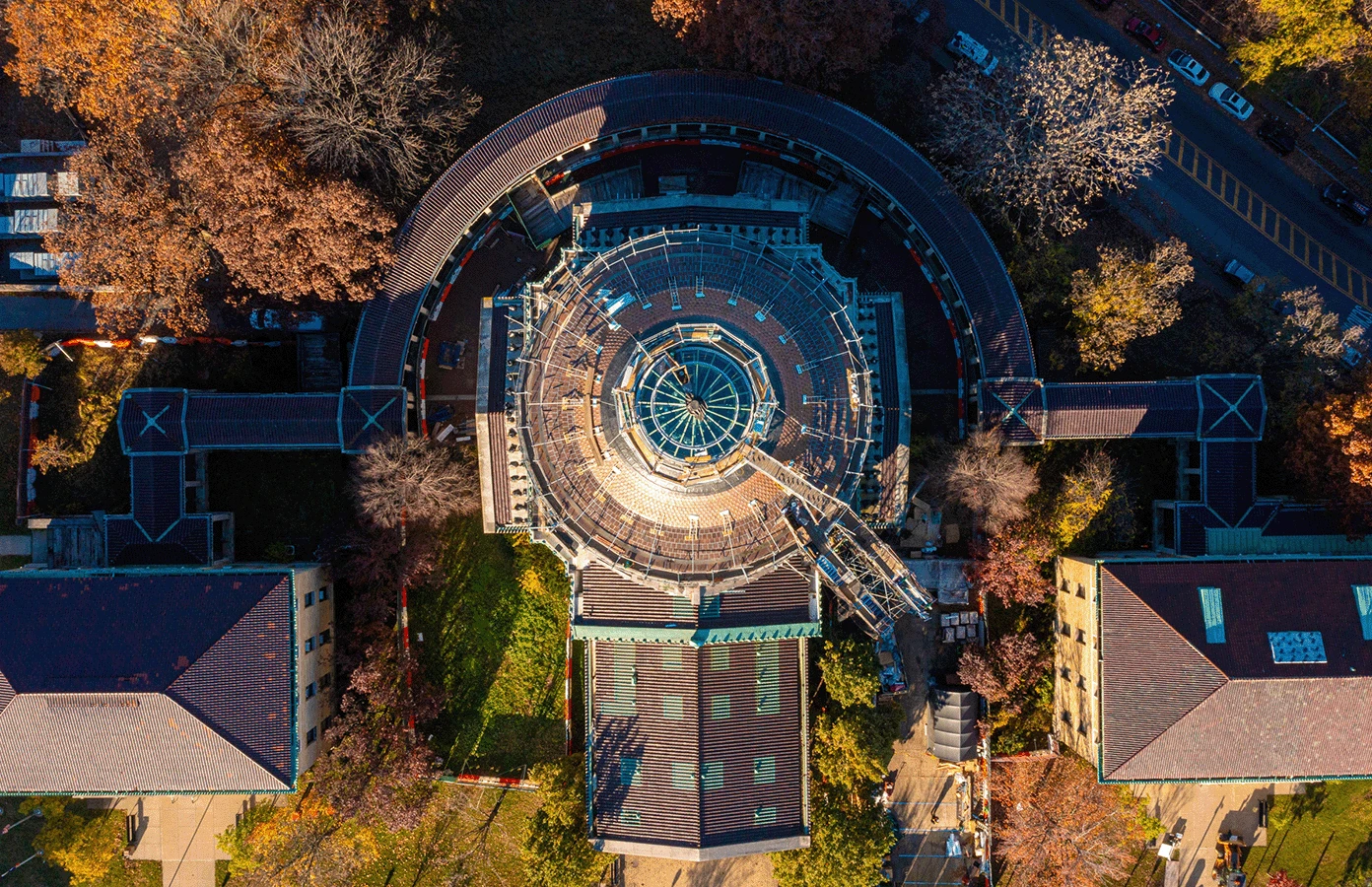 One of the obvious mandates of the roof restoration while preserving the history of the Gould Memorial Library was to prevent future water infiltration, which had long threatened the building’s historic interior and the dome’s structure. New copper replica shingles were needed to replace the worn material and address two original cladding design defects — lack of expansion joints and inadequate head lap. The shingles that were originally proposed to correct these flaws brought issues of their own, so H&L craftsmen worked on a solution that would both provide a traditional appearance and correct original defects. To learn more about the Gould Library historic roof restoration, browse our gallery of images.