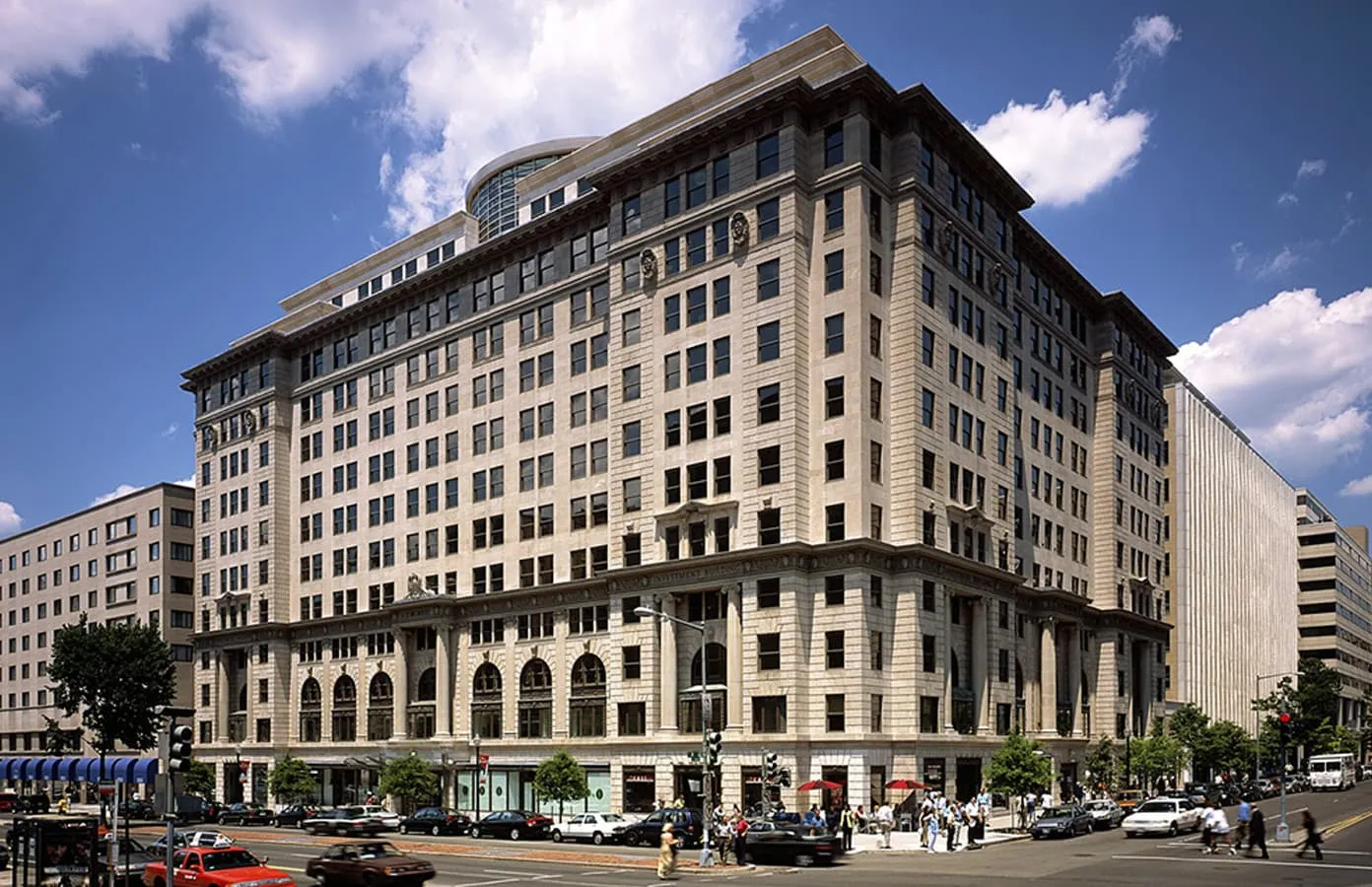 The Investment Building in Washington, D.C., is unique because it incorporates elements from an earlier structure of the same name. This original building was designed in 1910 by Jules Henri de Sibour and was eventually completed in 1924. At one point, part of the building was demolished, but its façade remained. Using the preserved façade and starting in 1999, a new building was constructed, and two floors added, as part of a complex architectural preservation project. The project ensured this historic landmark would stand for years to come.