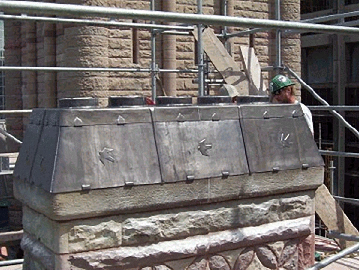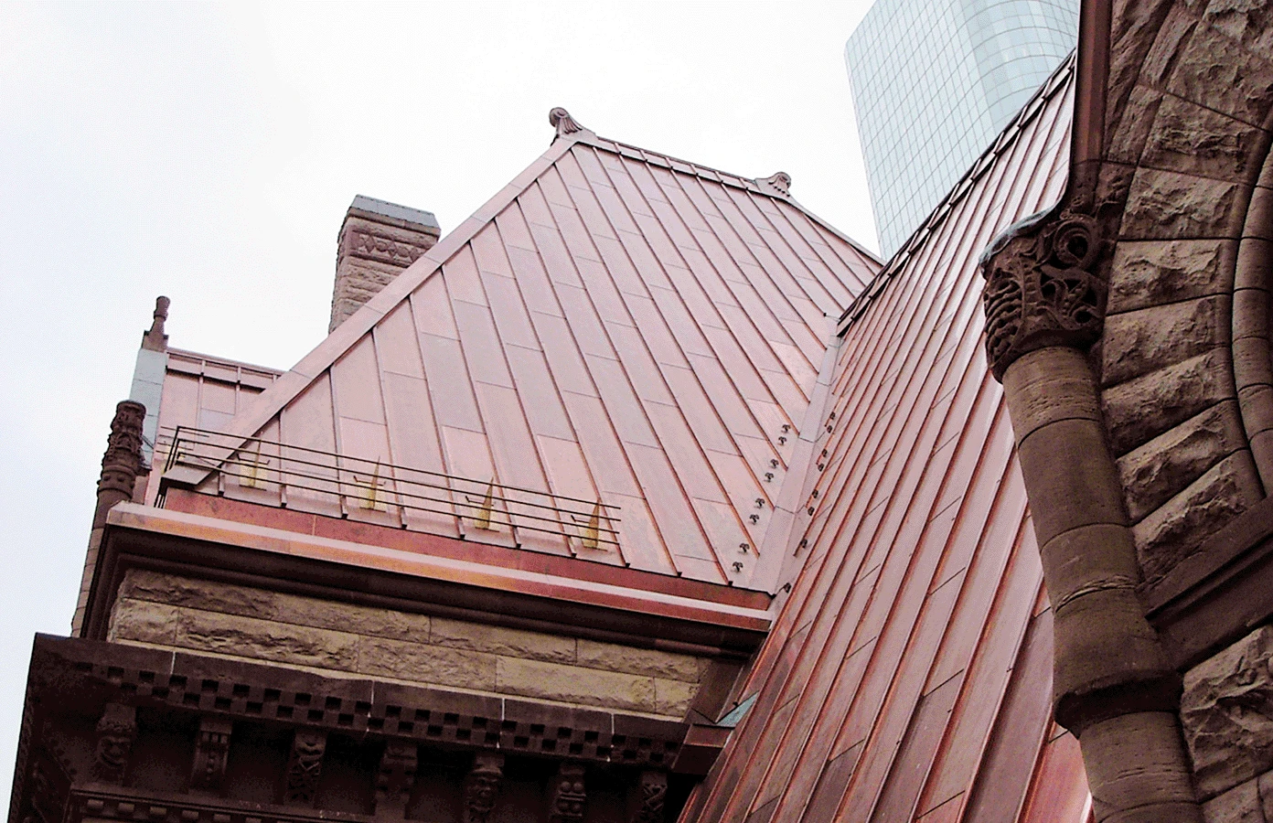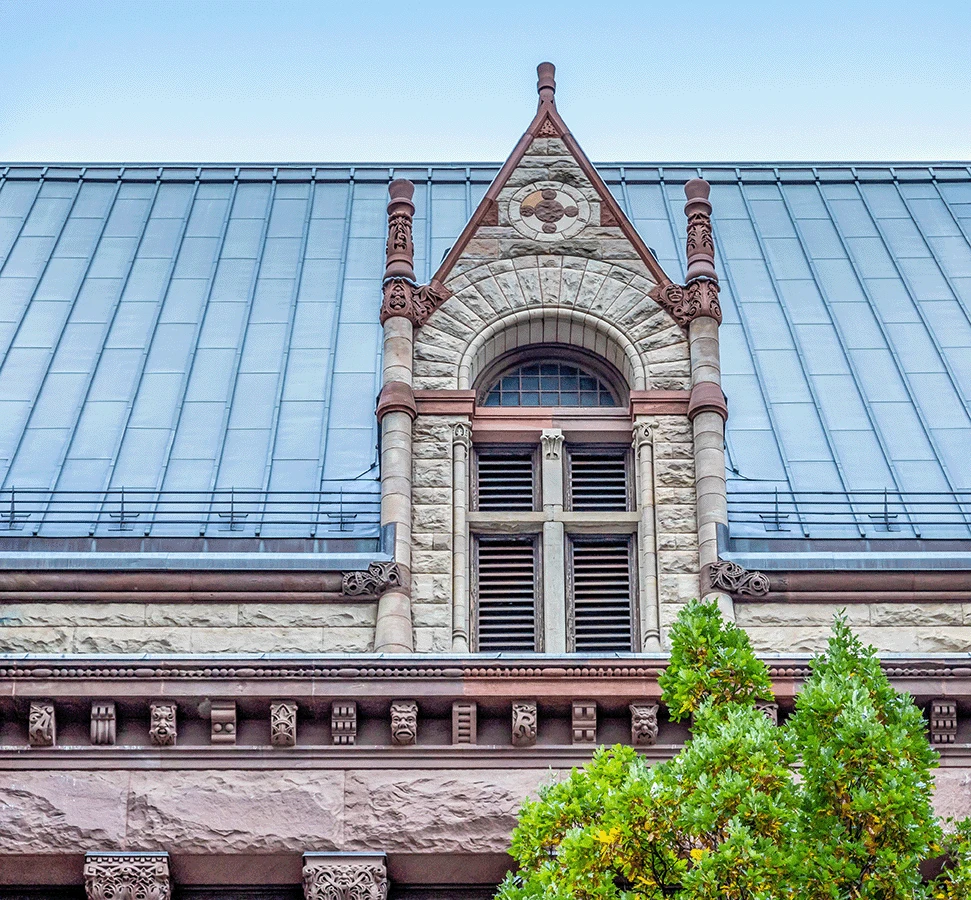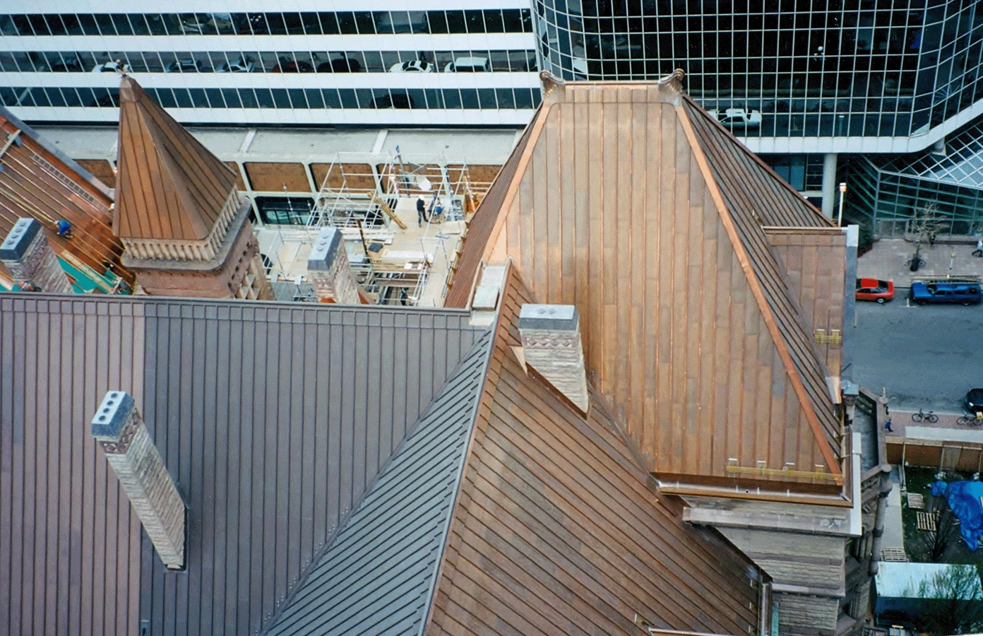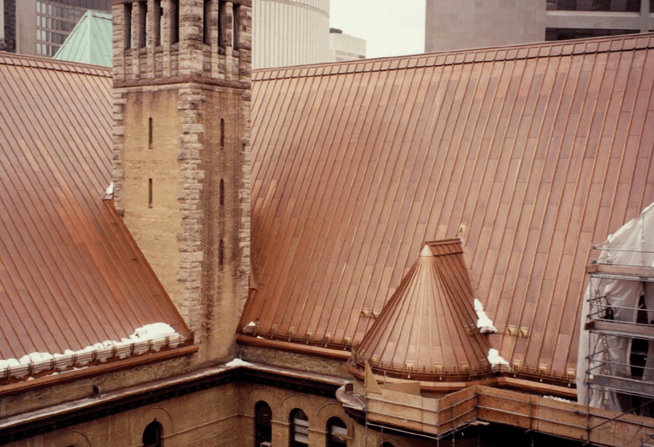 When Heather & Little took on this project, the entire sloped roof area including the clock tower required new copper roofing. This building restoration involved the reproduction of all the decorative sheet metal elements, bringing many of the details that were part of Architect E. J. Lennox's original vision back to life. The new roof is 20-oz. copper sheet, laid in a batten seam pattern. Because of the numerous dormers, snow guards were installed. Other details included the installation of bronze replicas of four stone Gargoyles that had been removed in 1938. This project granted us multiple awards for the work that was done. This includes the Project of the Year award from Canadian Roofing Contractors Association, and a North American Copper in Architecture Award (NACIA).