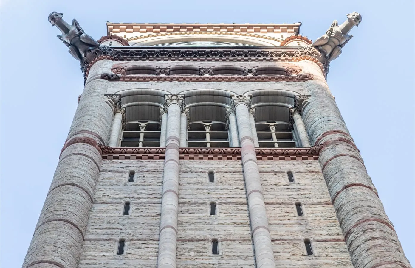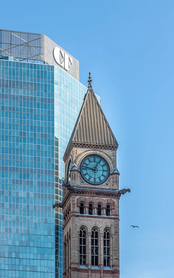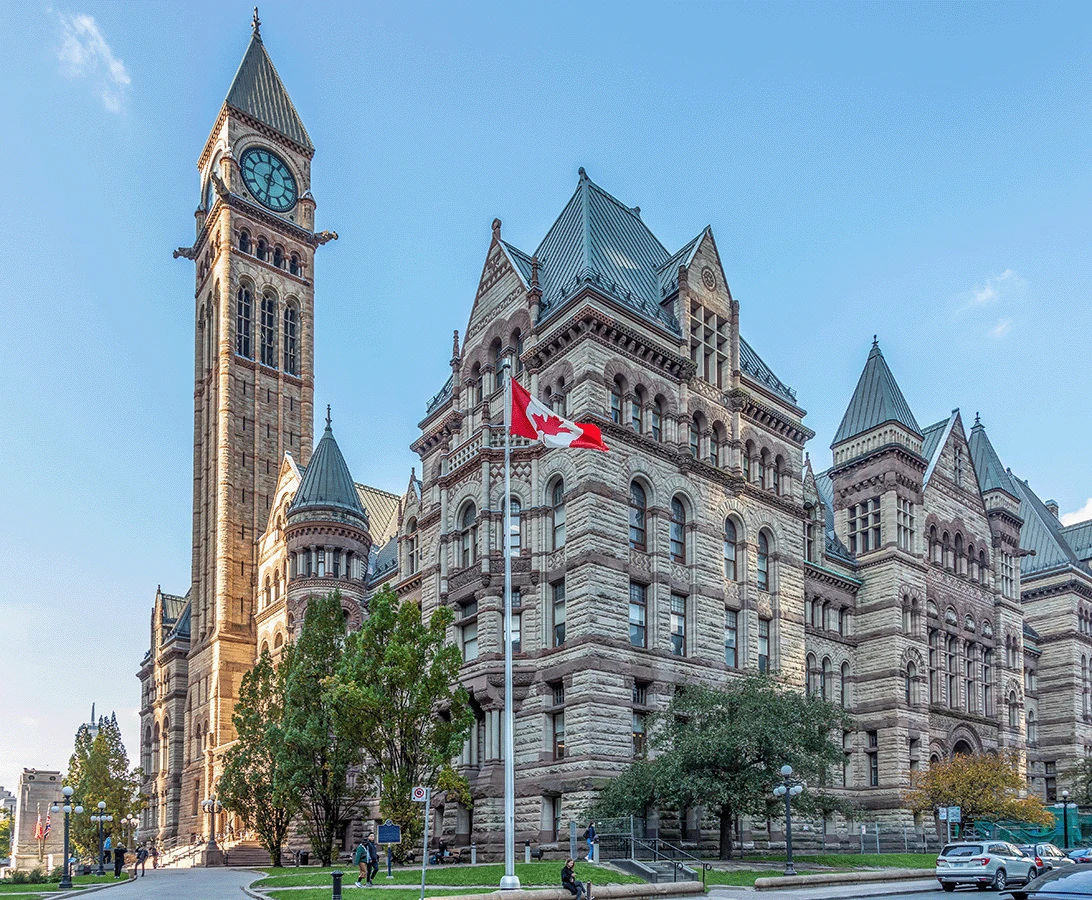 Toronto’s Old City Hall has been a prominent fixture in the skyline of the city since its completion in 1899. Designed in the Romanesque Revival style, the architectural highlights of the building include its square towers, asymmetric design, stone carvings and stone structures. Old City Hall also features a courtyard in the centre, making the building a hollow square in shape. Though only in use for 67 years as a proper city hall, this building was once the largest civic building in North America.
