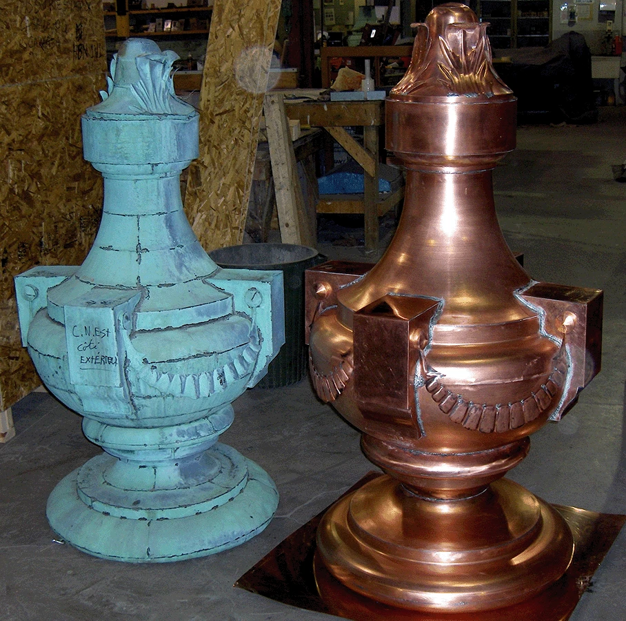 Properly restoring and replicating sheet metal statuary is a challenging undertaking, and requires many years of hands-on experience to get it right. H&L takes exceptional pride in our sheet metal statue restoration as ornamental metal fabricators, having re-created and restored numerous statuary across USA & Canada guided by existing work, drawings, historic photographs, as well as undertaking completely new designs.
