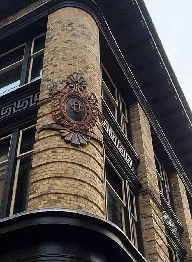 Creating the elegant sheet copper cornice was an exacting process involving hundreds of dentils. At first glance this doesn’t seem to be H&L ornamental metal fabrication work, but rather, terra cotta. Sheet copper work it is, however, which had to be laboriously finished before a special paint and sand finish could be applied.